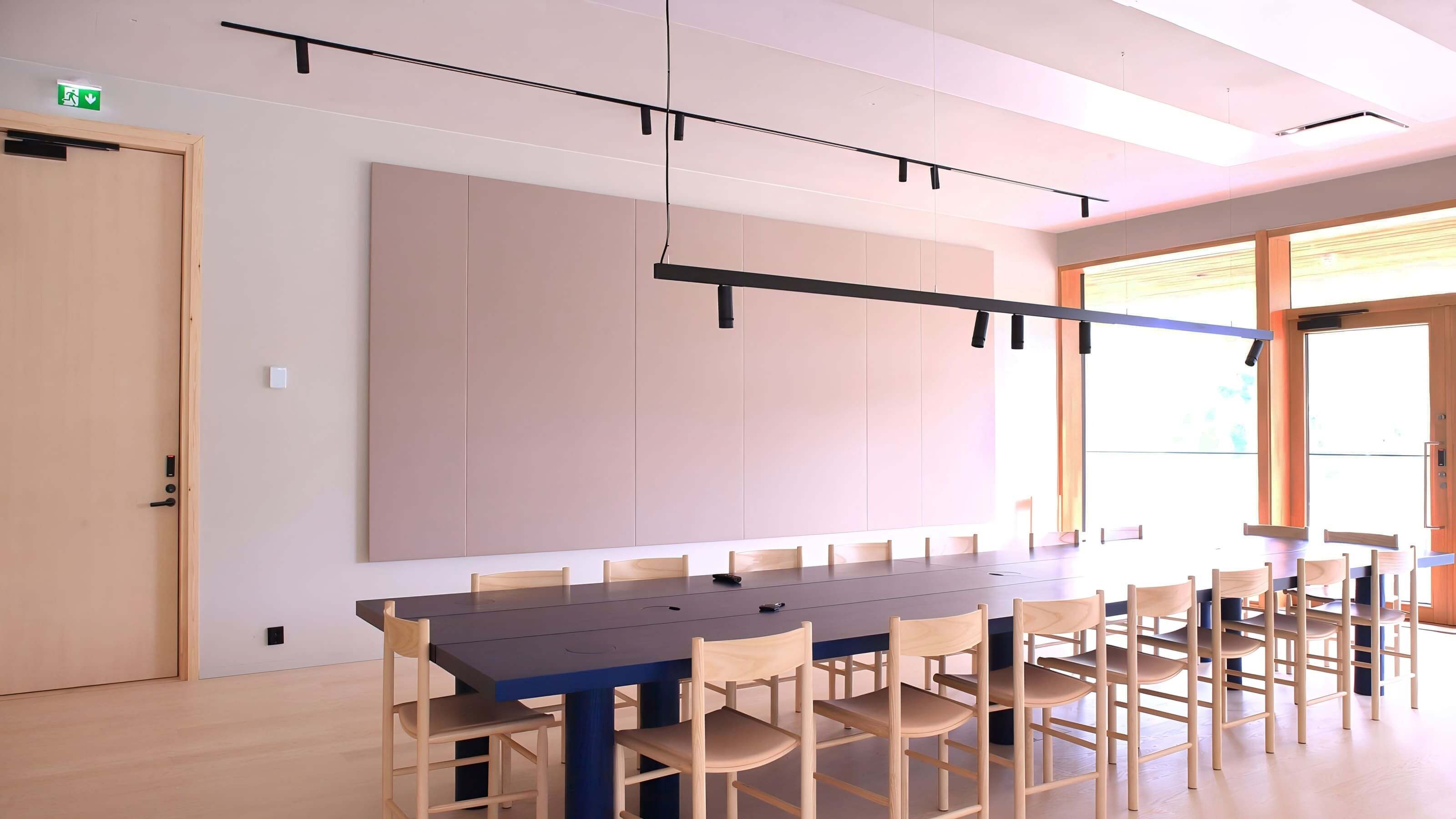 La iluminación de la luminosa sala de exposiciones de la planta baja, el restaurante y las salas de reuniones de la planta superior se realizó utilizando el sistema de rieles Moduline 26 de Neko. La iluminación general de estos espacios se creó con focos integrados y líneas de luz dentro del sistema de rieles.
