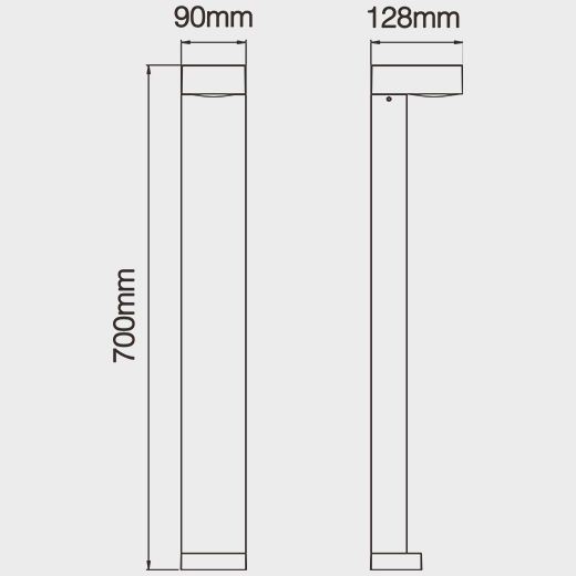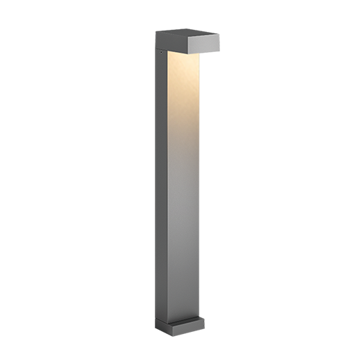 Bollard square made of die-cast aluminium with integrated ON-OFF Driver; dark-grey powder-coating finish (RAL 7024); LED 5W; measurement 128mm x 90mm; height of the luminaire is 700mm; luminaire’s weight is approximately 2800g; CCT 3000K with an System Output of 450lm; decent color rendering at an index of CRI80; after a lifetime of 50000h min. 80% of the luminous flux with energy efficient CREE LED Chips; 5 years warranty; beam characteristic with 270° beam angle; degree of housing protection according to DIN EN 60529 (IP65); Impact resistance of the luminaire is in the class IK07;