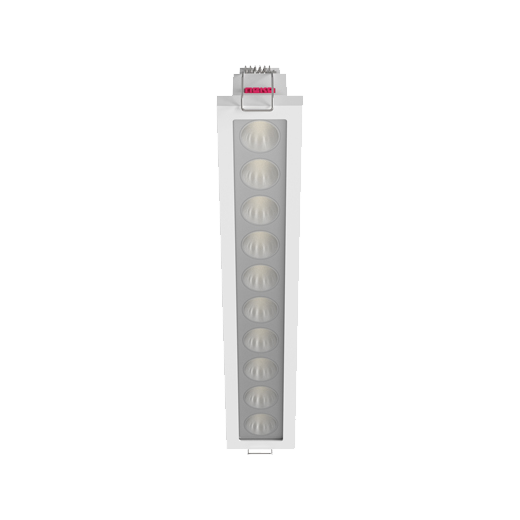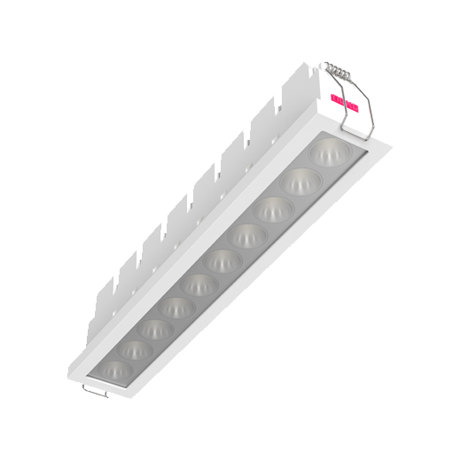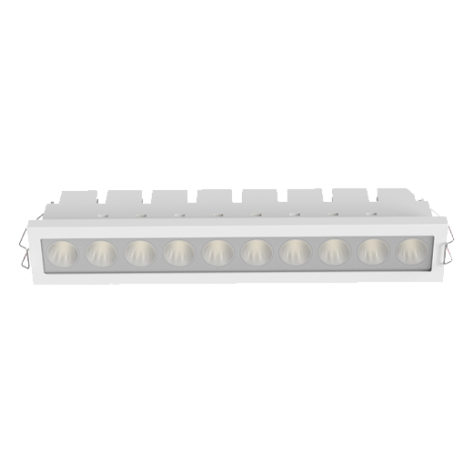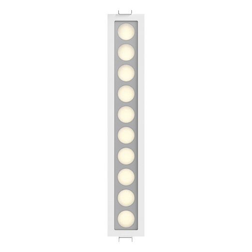 Square recessed ceiling downlight made of die-cast aluminium with white powder-coating finish (RAL 9016) and specular reflector; LED 22W; measurement 295mm x 50mm; ceiling cutout of 286mm x 37mm with a narrow mounting trim; CCT 2700K with an LED Output of 2400lm; decent color rendering at an index of CRI80; after a lifetime of 50000h min. 80% of the luminous flux with energy efficient OSRAM LED Chips; 5 years warranty; narrow beam characteristic with 35° beam angle; lighting perfectly suitable for reading, writing as well as computer and control work according to DIN EN 12464-1 (UGR<10); degree of housing protection according to DIN EN 60529 (IP65)