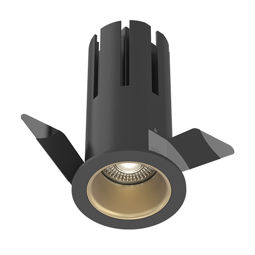 Round recessed downlight made of die-cast aluminium with black Wet Painting finish (RAL 9005) and gold reflector; System Power 8W; measurement Ø45mm; narrow mounting trim with a cutout of Ø38mm; luminaire’s height is 84mm; Ceiling Thickness 5-25mm; CCT 2700K with a System Luminous Flux of 420lm; high color rendering at an index of CRI90; after a lifetime of 50000h L80B10 min. 80% of the luminous flux with energy efficient CITIZEN LED Chips; 5 years warranty; beam characteristic with 38° beam angle; lighting perfectly suitable for reading, writing as well as computer and control work with UGR<19; degree of housing protection IP65(Front) on the visible part of the product one installed; light source replaceable by a qualified electrician; driver replaceable by a qualified electrician