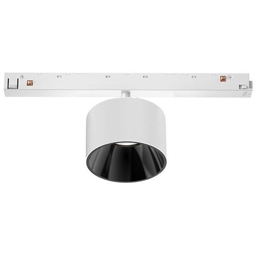 Single Spotlight Inset for 48V Low Voltage System; white finish (RAL 9016) and chrome black (Dark-Light) reflector; DALI Dim Driver; System Power 10W; measurements Ø72mm x 60mm; tool-free installation by “click-in/out” locking mechanism; CCT 2700K with a System luminous flux of 650lm; high color rendering at an index of CRI90; after a lifetime of 50000h L80B10 min. 80% of the luminous flux with energy efficient CITIZEN LED Chips; 5 years warranty; beam characteristic with 25° beam angle; lighting perfectly suitable for reading, writing as well as computer and control work with UGR<19; degree of housing protection IP20