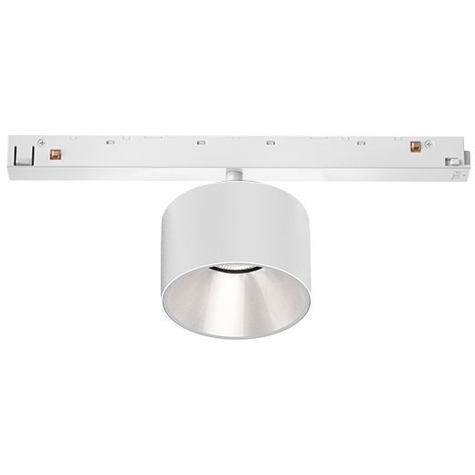 Single Spotlight Inset for 48V Low Voltage System; white finish (RAL 9016) and matt reflector; ON-OFF Driver; System Power 10W; measurements Ø72mm x 60mm; tool-free installation by “click-in/out” locking mechanism; CCT 2700K with a System luminous flux of 650lm; high color rendering at an index of CRI90; after a lifetime of 50000h L80B10 min. 80% of the luminous flux with energy efficient CITIZEN LED Chips; 5 years warranty; beam characteristic with 25° beam angle; lighting perfectly suitable for reading, writing as well as computer and control work with UGR<19; degree of housing protection IP20