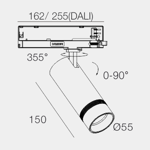Tracklight made of extrusion aluminium with black powder-coating finish (RAL 9005) and black reflector; LED 13W, measurement Ø55mm; tracklights length 150mm; track adapters length 255mm; luminaire’s weight is approximately 500g; rotation 355° and pivot max. 90°; CCT 3000K with an LED Output of 1400lm; with DALI Dim Driver; decent color rendering at an index of CRI80; after a lifetime of 50000h min. 80% of the luminous flux with energy efficient CITIZEN LED Chips; 5 years warranty; adjustable beam characteristic with 35°-60° beam angle; lighting perfectly suitable for reading, writing as well as computer and control work according to DIN EN 12464-1 (UGR<19); degree of housing protection according to DIN EN 60529 (IP20); Compatible with GLOBAL/ POWERGEAR 3-Circuit Track System