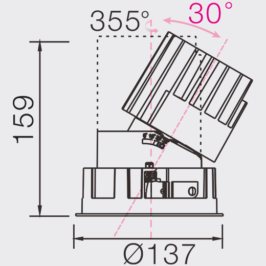 Round recessed downlight made of die-cast aluminium with white powder-coating finish (RAL 9016) and black reflector; System Power 21W; measurements Ø137mm x 159mm; ceiling cutout of Ø125mm with a narrow mounting trim; ceiling thickness 1-30mm; rotation 355° and pivot max. 30°; CCT 2700K with a System luminous flux of 1600lm; high color rendering at an index of CRI90; after a lifetime of 50000h L80B10 min. 80% of the luminous flux with energy efficient CITIZEN LED Chips; 5 years warranty; beam characteristic with 20° beam angle; lighting perfectly suitable for reading, writing as well as computer and control work with UGR<19; degree of housing protection IP54; light source replaceable by a qualified electrician; driver replaceable by a qualified electrician