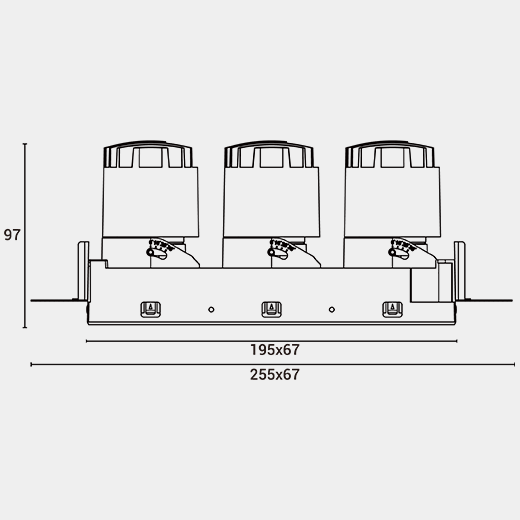 Quadratisches, randloses Einbaudownlight aus Aluminiumdruckguss mit weiß Pulverbeschichtung (RAL 9016) und spiegelnd reflektor; Systemleistung 3*9W; Abmessungen 195×67mm x 97mm; Deckenausschnitt von 197×70mm mit schmalem Einbaurahmen; Deckenstärke 2-22.5mm; Drehbarkeit 355° und Schwenkbarkeit max. 30°; CCT 2700K mit einem Systemlichtstrom von 620lm; hohe Farbwiedergabe bei einem Index von CRI90; nach einer Lebensdauer von 50000h L80B10 min. 80% des Lichtstroms mit energieeffizienten CITIZEN LED Chips; 5 Jahre Garantie; Abstrahlcharakteristik mit 18° Abstrahlwinkel; Beleuchtung perfekt geeignet zum Lesen, Schreiben sowie für Computer- und Steuerungsarbeiten mit UGR<19; Gehäuseschutzart IP20 (LED Modul IP54); Leuchtmittel austauschbar durch eine Elektrofachkraft; Treiber austauschbar durch eine Elektrofachkraft