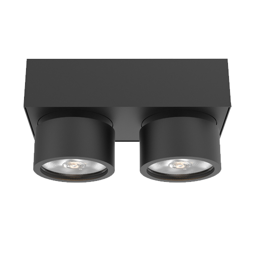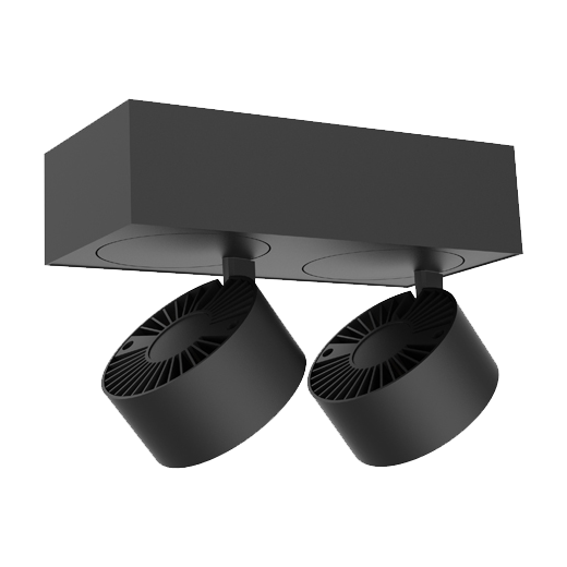Deckenanbau Spotlight Double aus aluminiumdruckguss; Pulverbeschichtete schwarze Oberfläche (RAL-Farbcode 9005); Phase Dim Treiber im Montagesockel integriert; Systemleistung 28W; Netzspannung 220–240V ~50/60Hz; Abmessung pro Spotlight Ø77mm x 38mm; Abmessung rechteckiger Montagesockel 189mm x 89mm x 50mm; 360° dreh- und 90° schwenkbar; Lichtfarbe 3000K bei einem Systemlichtstrom von 2400lm; hohe Farbwiedergabe bei einem Index von CRI90; min. 80% des Lichtstromes nach 50000h Lebensdauer mit energieeffizienten CITIZEN LED Chip; 5 Jahre Herstellergarantie; Abstrahlcharakteristik mit 36° Abstrahlwinkel; Schutzart des Gehäuses IP20; Lichtquelle durch Elektrofachkraft austauschbar; Treiber durch Elektrofachkraft austauschbar