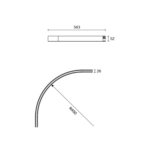 MODULINE 26 48V Schiene; Standard Kurvenschiene aus hochwertigem Aluminium-Strangpressprofil; schwarz pulverbeschichtet (RAL 9005); Schienenabmessungen 563mm x 26mm; Schienenhöhe 52mm; Radius: 450mm, 1/4 Kreis; optionaler Montagesatz für Deckenaufbaumontage oder Pendelmontage erhältlich; optionale lineare und elektrische Verbinder erhältlich; 5 Jahre Garantie; Gehäuseschutzart IP20; Schutzklasse III