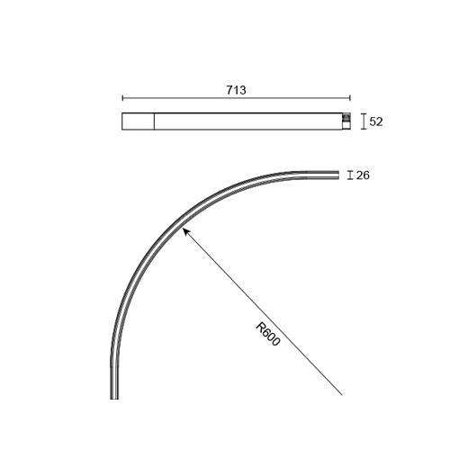 MODULINE 26 48V Schiene; Standard Kurvenschiene aus hochwertigem Aluminium-Strangpressprofil; pulverbeschichtet weiß (RAL 9016); Schienenabmessungen 713mm x 26mm; Schienenhöhe 52mm; Radius: 600mm, 1/4 Kreis; optionales Montagekit für Deckenaufbaumontage oder Pendelmontage erhältlich; optional lineare und elektrische Verbinder erhältlich; 5 Jahre Garantie; Gehäuseschutzart IP20; Schutzklasse III