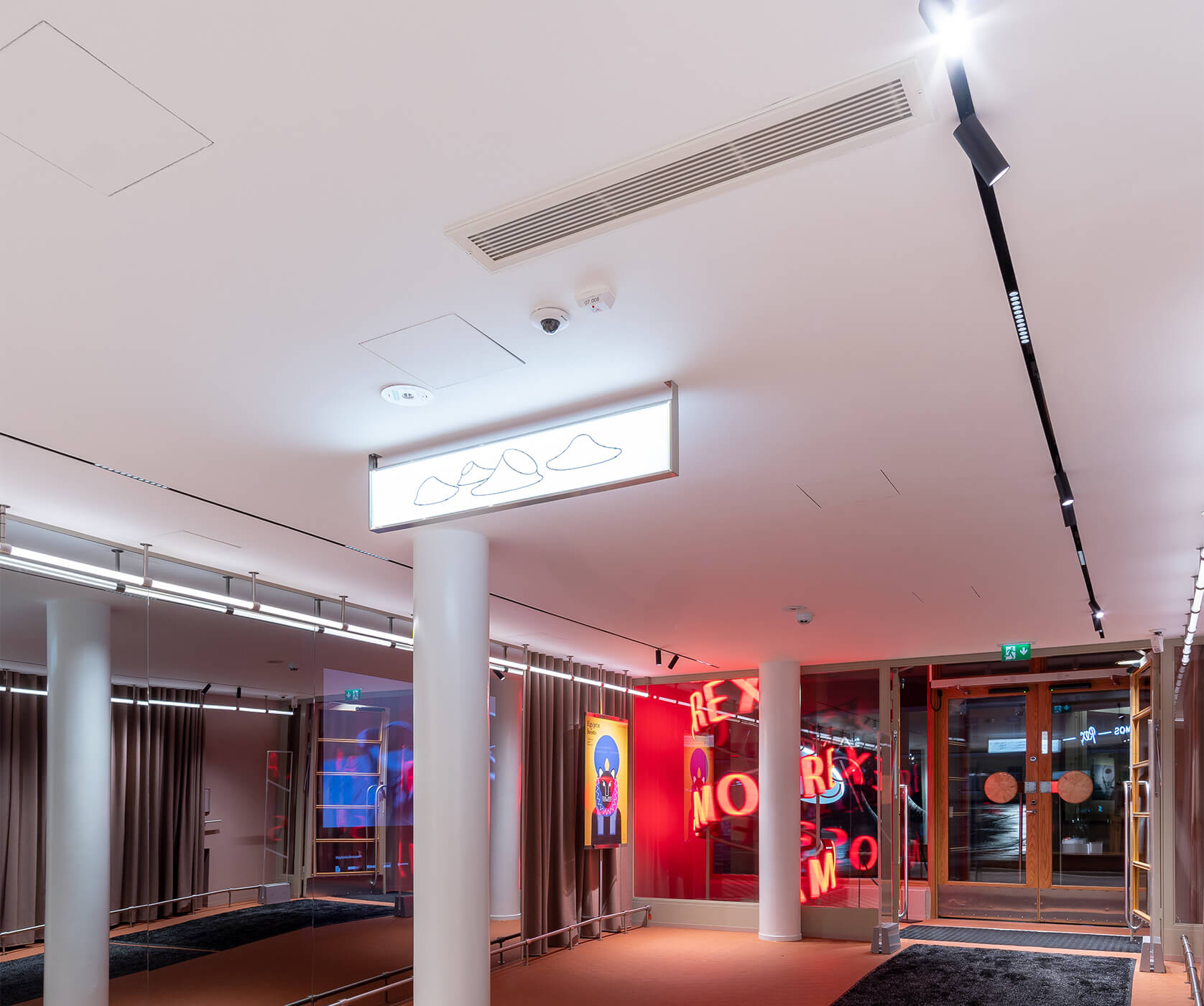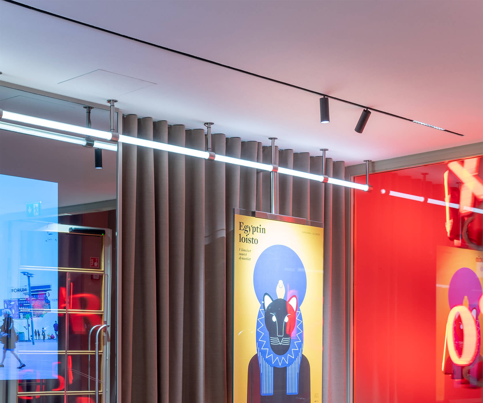 Im Zuge von Renovierungsarbeiten des Amos Rex Museums im finnischen Helsinki wurde eine Lösung gesucht, die individuell zur gegebenen Architektur gestaltbar ist und zusätzlich die Möglichkeit bietet, im Nachhinein die Position der Lichteinsätze zu ändern, falls sich Ausstellungsräume in der Gestaltung ändern.