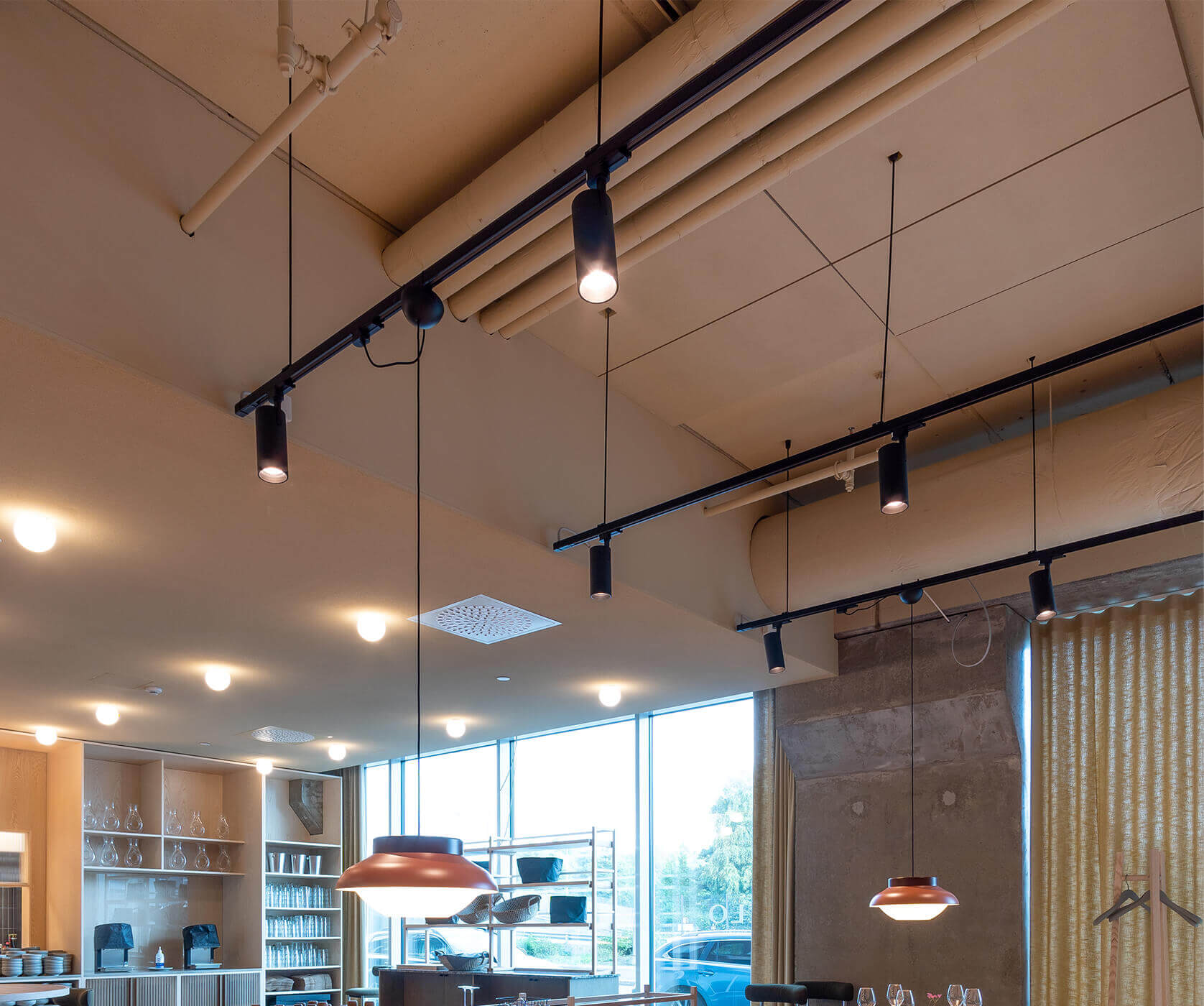 In the ELO restaurant, our PURE M spotlight sets pleasant accents in suspended tracks. The contrast of the black tracklights to the bright overall architecture make the Restraunt a real eye-catcher. In addition, the PURE ensures a pleasantly warm lighting atmosphere with the aim of the tables. With a system power of only 28W, the LED spotlight adapts to the sustainable concept of the VALO Hotel and convinces with significantly better energy efficiency compared to conventional halogen spotlights. Long operating times and frequent switching cycles are special advantages of LED lighting.