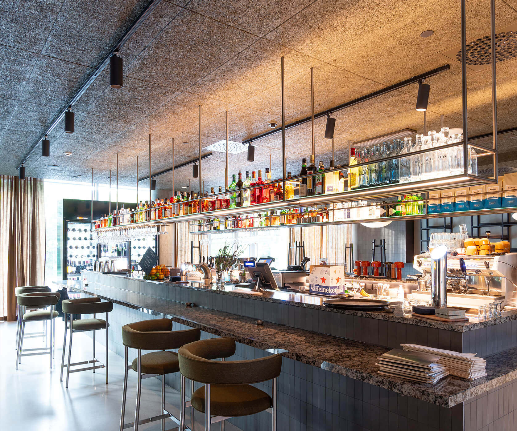 After the dinner at the ELO, the evening can be continued in the Lounge & Bar SUO. In the bar area and above the seats, the tracks were mounted directly on the ceiling. Our PURE M spotlights have been used in this area as well with have excellent anti-glare. They illuminate workplaces at the bar and provide the right light for the visual tasks of the employees. The guests at the bar feel comfortable by avoiding glare in their seats.