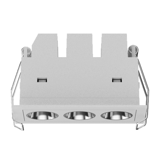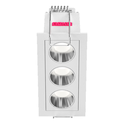 Downlight cuadrado empotrado en el techo fabricado en aluminio fundido a presión con acabado de pintura en polvo blanco (RAL 9016 ) y reflector especular; LED 7W; medida 98mm x 45mm; recorte de techo de 90mm x 37mm con un embellecedor de montaje estrecho; el peso de la luminaria es de aproximadamente 180g; CCT 2700K con una salida LED de 700lm; reproducción cromática decente con un índice CRI80; tras una vida útil de 50000h min. 80% del flujo luminoso con chips LED OSRAM de bajo consumo; 5 años de garantía; característica del haz con un ángulo de haz de 40°; iluminación perfectamente adecuada para leer, escribir, así como para trabajos de ordenador y control según DIN EN 12464-1 (UGR<10); grado de protección de la carcasa según DIN EN 60529 (IP20)