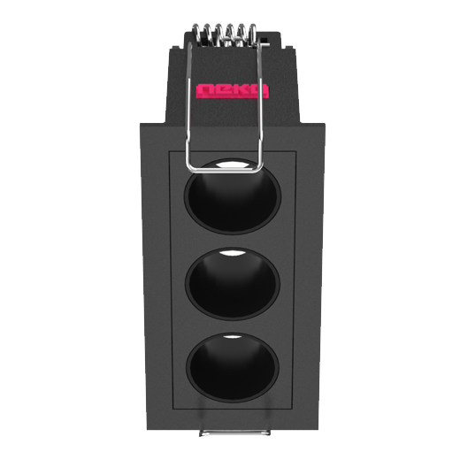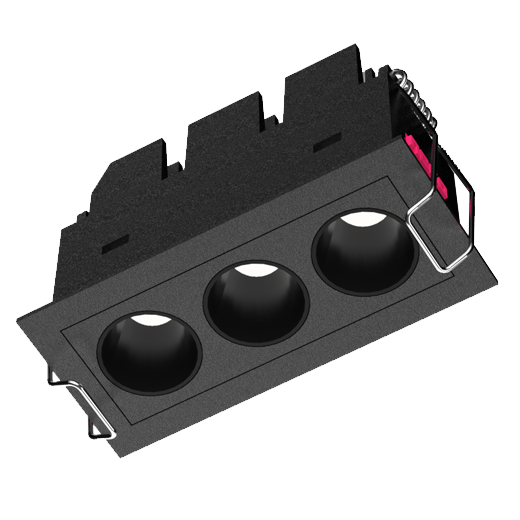 Downlight cuadrado empotrado en el techo fabricado en aluminio fundido a presión con acabado de pintura en polvo negro (RAL 9005 ) y reflector negro; LED 7W; medida 98mm x 45mm; recorte de techo de 90mm x 37mm con un embellecedor de montaje estrecho; el peso de la luminaria es de aproximadamente 180g; CCT 4000K con una salida LED de 800lm; reproducción cromática decente con un índice CRI80; tras una vida útil de 50000h min. 80% del flujo luminoso con chips LED OSRAM de bajo consumo; 5 años de garantía; característica del haz con un ángulo de haz de 24°; iluminación perfectamente adecuada para leer, escribir, así como para trabajos de ordenador y control según DIN EN 12464-1 (UGR<10); grado de protección de la carcasa según DIN EN 60529 (IP20)