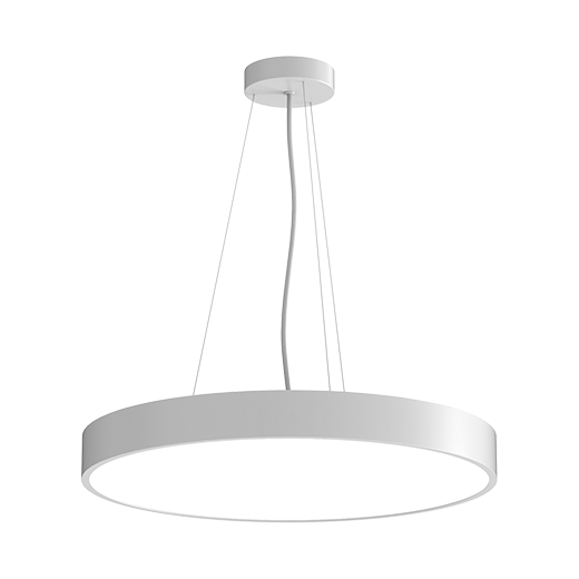 Lámpara colgante redonda con cubierta microprismática fabricada en aluminio fundido a presión con acabado en pintura en polvo blanco (RAL 9016); controlador 0-10V; potencia del sistema 43W; dimensiones Ø600mm x 65mm; CCT 3000K/3500K/4000K conmutable con flujo luminoso del sistema de 5630lm@3000K, 5740lm@3500K y 5850lm@4000K; alto índice de reproducción cromática de CRI 80; Después de una vida útil de 50 000 h L80B10, mínimo 80 % del flujo luminoso con chips LED EBright de bajo consumo; 5 años de garantía; haz amplio con ángulo de 80°; grado de protección de la carcasa IP44; fuente de luz sustituible por un electricista cualificado; controlador sustituible por un electricista cualificado.