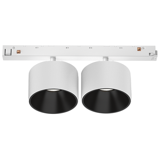 Foco doble empotrable para sistema de baja tensión de 48V; acabado blanco (RAL 9016) y reflector negro; driver 1-10V Dim; potencia del sistema 20W; medidas Ø72mm x 60mm; instalación sin herramientas mediante mecanismo de bloqueo «click-in/out; CCT 2700K con un flujo luminoso del sistema de 1300lm; alta reproducción cromática con un índice CRI90; tras una vida útil de 50000h L80B10 min. 80% del flujo luminoso con CITIZEN LED Chips energéticamente eficientes; 5 años de garantía; característica de haz con ángulo de haz de 25°; iluminación perfectamente adecuada para leer, escribir, así como para trabajos de ordenador y control con UGR<19; grado de protección de la carcasa IP20.