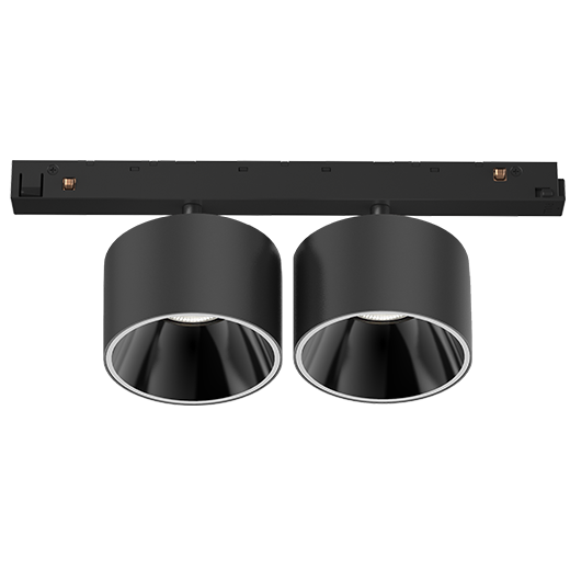 Foco doble empotrable para sistema de baja tensión de 48V; acabado negro (RAL 9005) y reflector oscuro claro; driver DALI Dim; potencia del sistema 20W; medidas Ø72mm x 60mm; instalación sin herramientas mediante mecanismo de bloqueo «click-in/out; CCT 2700K con un flujo luminoso del sistema de 1300lm; alta reproducción cromática con un índice CRI90; tras una vida útil de 50000h L80B10 min. 80% del flujo luminoso con CITIZEN LED Chips energéticamente eficientes; 5 años de garantía; característica de haz con ángulo de haz de 25°; iluminación perfectamente adecuada para leer, escribir, así como para trabajos de ordenador y control con UGR<19; grado de protección de la carcasa IP20.