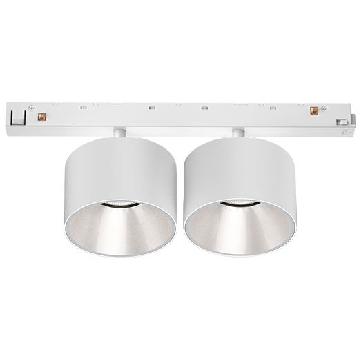 Foco doble empotrable para sistema de baja tensión de 48V; acabado blanco (RAL 9016) y reflector mate; driver DALI Dim; potencia del sistema 20W; medidas Ø72mm x 60mm; instalación sin herramientas mediante mecanismo de bloqueo «click-in/out; CCT 2700K con un flujo luminoso del sistema de 1300lm; alta reproducción cromática con un índice CRI90; tras una vida útil de 50000h L80B10 min. 80% del flujo luminoso con CITIZEN LED Chips energéticamente eficientes; 5 años de garantía; característica de haz con ángulo de haz de 25°; iluminación perfectamente adecuada para leer, escribir, así como para trabajos de ordenador y control con UGR<19; grado de protección de la carcasa IP20.