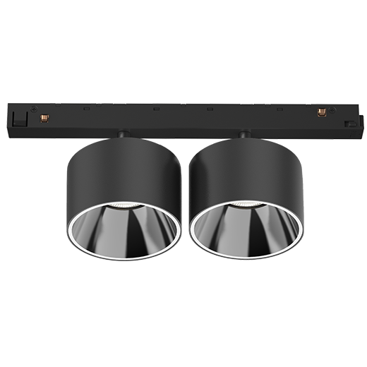 Foco doble empotrable para sistema de baja tensión de 48V; acabado negro (RAL 9005) y reflector especular; driver ON-OFF; potencia del sistema 20W; medidas Ø72mm x 60mm; instalación sin herramientas mediante mecanismo de bloqueo «click-in/out; CCT 2700K con un flujo luminoso del sistema de 1300lm; alta reproducción cromática con un índice CRI90; tras una vida útil de 50000h L80B10 min. 80% del flujo luminoso con CITIZEN LED Chips energéticamente eficientes; 5 años de garantía; característica de haz con ángulo de haz de 25°; iluminación perfectamente adecuada para leer, escribir, así como para trabajos de ordenador y control con UGR<19; grado de protección de la carcasa IP20.
