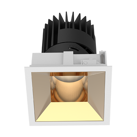 Downlight empotrable Cuadrado de aluminio fundido a presión con acabado de pintura en polvo Blanco (RAL 9016) y reflector Oro; potencia del sistema 28W; medidas 159mm x 159mm x 190mm; recorte de techo de 147mm x 147mm con un embellecedor de montaje estrecho; espesor del techo 1-35mm; CCT 2700K con un flujo luminoso del sistema de 1800lm; alta reproducción cromática con un índice CRI90; tras una vida útil de 50000h L80B10 min. 80% del flujo luminoso con CITIZEN LED Chips energéticamente eficientes; 5 años de garantía; característica del haz con un ángulo del haz de 24°; iluminación perfectamente adecuada para leer, escribir, así como para trabajar con ordenadores y controles con UGR<19; grado de protección de la carcasa IP54; fuente de luz sustituible por un electricista cualificado; driver sustituible por un electricista cualificado