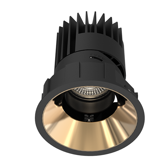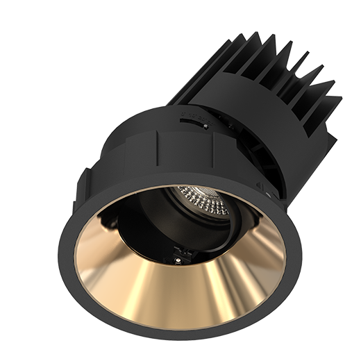 Downlight empotrable Redondo de aluminio fundido a presión con acabado de pintura en polvo Negro (RAL 9005) y reflector Oro; potencia del sistema 21W; medidas Ø137mm x 159mm; recorte de techo de Ø125mm con un embellecedor de montaje estrecho; grosor de techo 1-30mm; rotación 355° y pivote máx. 30°; CCT 2700K con un flujo luminoso del sistema de 1600lm; alta reproducción cromática con un índice CRI90; tras una vida útil de 50000h L80B10 min. 80% del flujo luminoso con CITIZEN LED Chips de bajo consumo; 5 años de garantía; característica de haz con ángulo de haz de 20°; iluminación perfectamente adecuada para leer, escribir, así como para trabajos de ordenador y control con UGR<19; grado de protección de la carcasa IP54; fuente de luz sustituible por un electricista cualificado; driver sustituible por un electricista cualificado