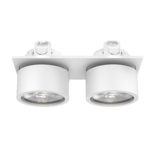 Double Spot encastré en aluminium moulé ; finition thermolaquée blanc (RAL 9016) ; Driver Phase Dim inclus dans la base de montage ; Puissance Système 28W ; tension nominale primaire 220-240V ~50/60Hz ; dimensions par spot Ø77mm x 38mm ; dimensions base de montage 185mm x 85mm x 31mm ; cadre avec une découpe de 172mm x 75mm ; orientable à 360° et pivotant à 90° ; Température de couleur 3000K avec un Flux lumineux de 2400lm ; indice de rendu des couleurs élevé IRC90 ; après une durée de vie de 50000h L80B10 min. 80% du flux lumineux avec des LED CITIZEN écoénergétiques ; Garantie 5 ans ; angle de faisceau de 36° ; degré de protection du boîtier IP20 ; source lumineuse remplaçable par un électricien qualifié ; convertisseur remplaçable par un électricien qualifié