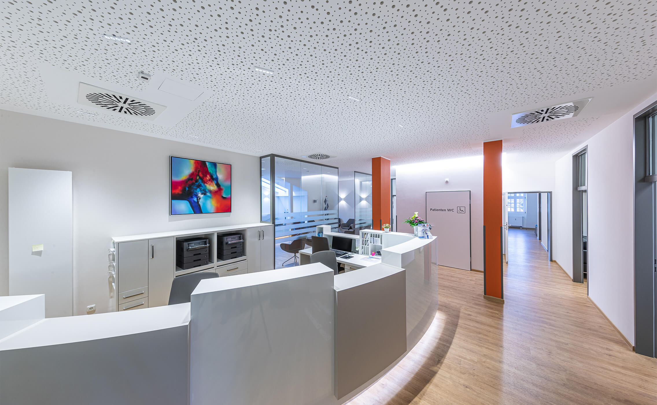 Dans l’entrée, l’encastrable plafond FF5 a été intégré au-dessus de la réception afin que les patients se dirigent naturellement vers l’accueil et que les postes de travail des secrétaires bénéficient d’un éclairage homogène. La température de couleur de 4000 kelvins assure un éclairage vif et clair visant à réconforter les patients, à réduire leur inquiétude et leur appréhension avant l’examen. L’angle de diffusion de 40° assure un éclairage large de l’espace d’accueil.