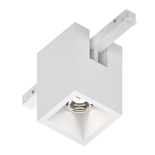 Downlight quadrato da incasso per sistemi a bassa tensione da 48V; può essere montato solo su binari standard; finitura bianco (RAL 9016) e riflettore bianco; driver ON-OFF; potenza di sistema 10W; misure 80mm x 80mm; installazione senza attrezzi grazie al meccanismo di bloccaggio “click-in/out”; CCT 4000K con un flusso luminoso di sistema di 1050lm; alta resa cromatica con un indice CRI90; dopo una durata di 50000h L80B10 min. 80% del flusso luminoso con chip LED CITIZEN ad alta efficienza energetica; 5 anni di garanzia; caratteristica del fascio luminoso con angolo di apertura di 30°; illuminazione perfettamente adatta per la lettura, la scrittura e il lavoro al computer e al controllo con UGR<19; grado di protezione dell'involucro IP20
