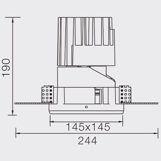 Downlight quadrato da incasso a soffitto in alluminio pressofuso con verniciatura a polvere nero (RAL 9005) e riflettore opaco; LED 25W; misure 145mm x 145mm x 190mm; ritaglio a soffitto di 147mm x 147mm con un bordo di montaggio stretto; spessore del soffitto 12.5-25mm; CCT 2700K con una resa di sistema di 1050lm; alta resa cromatica con un indice CRI90; dopo una vita di 50000h min. 80% del flusso luminoso con chip LED CITIZEN ad alta efficienza energetica; 5 anni di garanzia; Wall Washer; illuminazione perfettamente adatta per un’ampia illuminazione di superfici a parete per consentire una distribuzione omogenea della luce; grado di protezione dell’involucro IP54; sorgente luminosa sostituibile da un elettricista qualificato; driver sostituibile da un elettricista qualificato